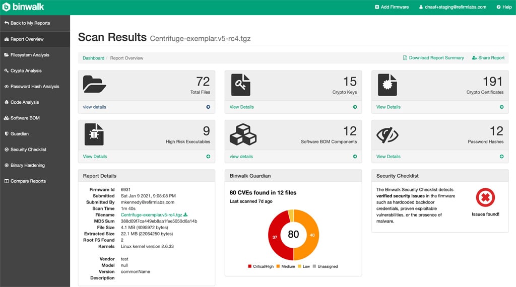 Il team di ReFirm Labs ha sviluppato il software open source Binwalk, che è stato utilizzato per analizzare migliaia di tipi di dispositivi per i problemi di sicurezza del firmware.