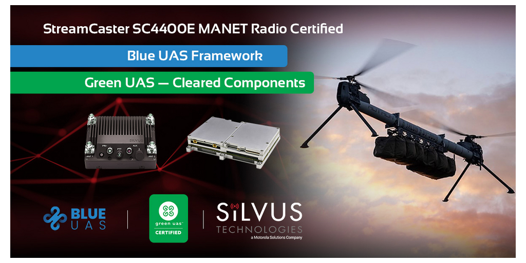 CHICAGO--(BUSINESS WIRE)--Silvus Technologies (Silvus), a Motorola Solutions (NYSE: MSI) company and a global leader in advanced wireless networking solutions, today announced that the U.S. Department of Defense (DoD) Defense Innovation Unit (DIU) has added the StreamCaster 4400 Enhanced (SC4400E) mobile ad-hoc network (MANET) radio to its Blue UAS Framework, a rigorous testing and certification program that approves technologies for use in U.S. military unmanned aircraft system (UAS) operations. The Association of Uncrewed Vehicle Systems International (AUVSI) has also added the SC4400E to its Green UAS Cleared Components list, certifying it meets rigorous cybersecurity and supply chain standards for commercial drones and components.