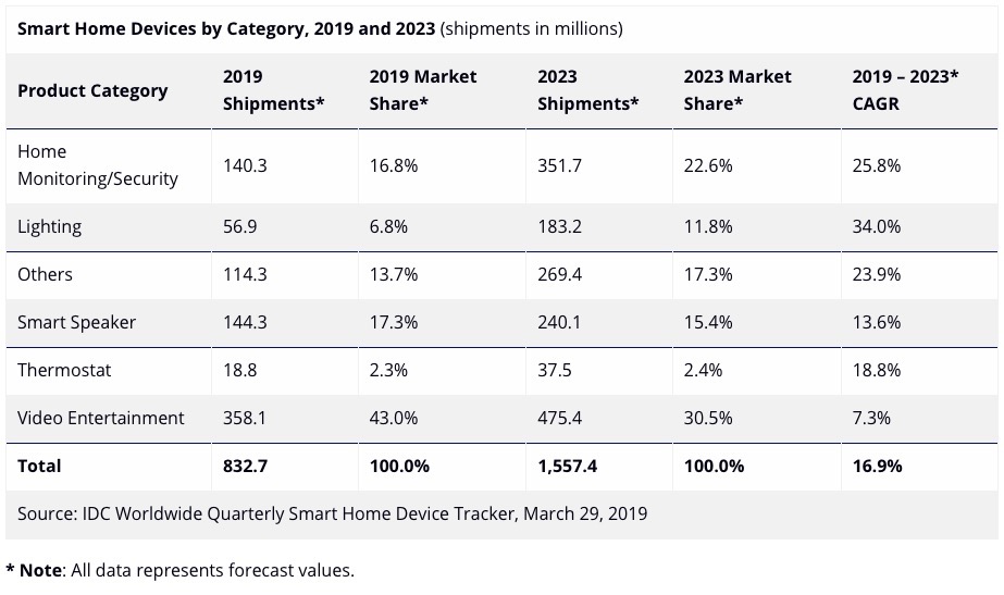 IDC prevede che il mercato globale dei dispositivi per la smart home crescerà del 26,9% su base annua nel 2019. Raggiungendo un volume di 832,7 milioni di spedizioni.