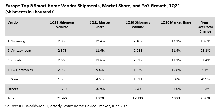 Secondo lo specialista di market intelligence International Data Corporation (IDC), il mercato smart home in Europa ha movimentato quasi 23 milioni di unità nel primo trimestre del 2021. Con una crescita del 25,6% rispetto allo stesso trimestre dello scorso anno.