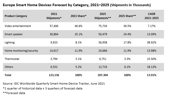 Inoltre, secondo gli analisti di IDC, il mercato della smart home dovrebbe continuare la sua traiettoria di crescita, raggiungendo più di 207 milioni di unità in Europa nel 2025 per un tasso di crescita annuale composto (CAGR) del 13,961% nel periodo 2020-2025.