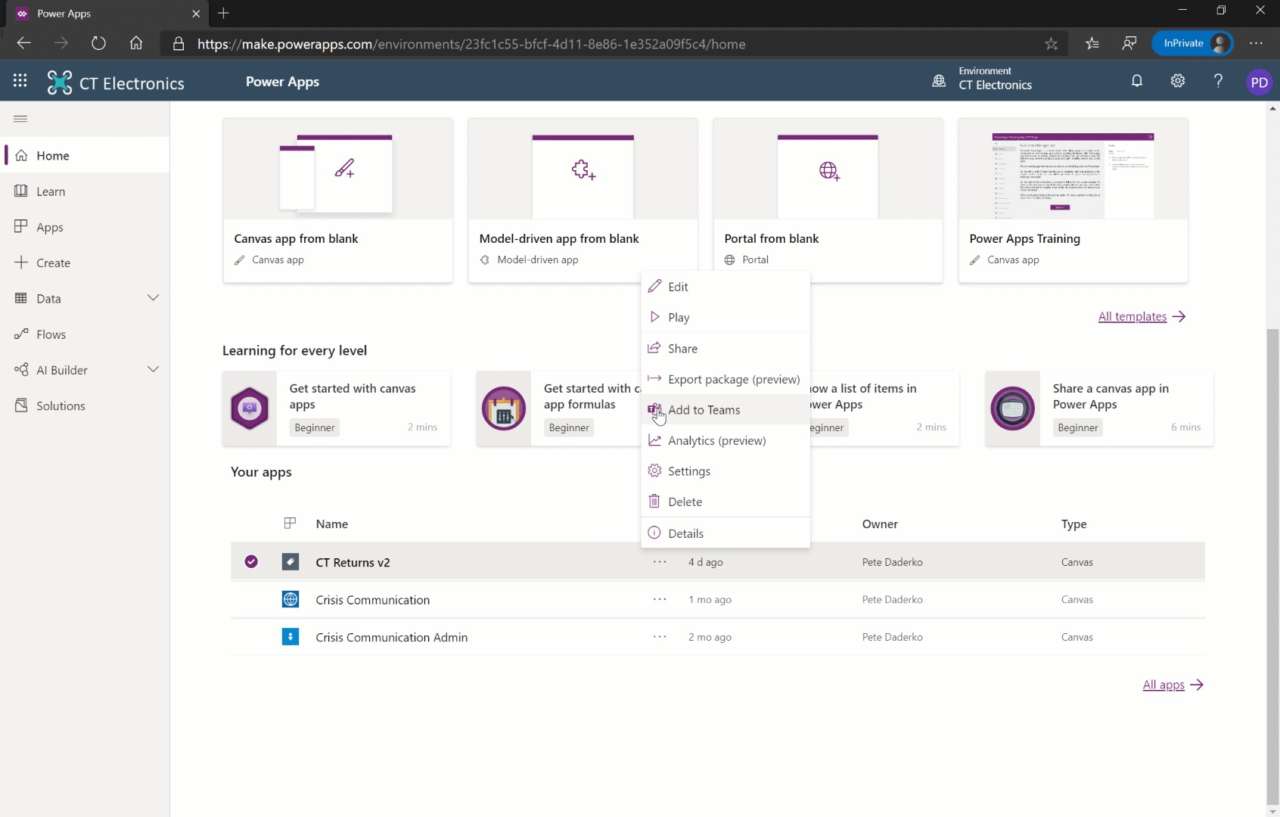 Microsoft sta anche introducendo un nuovo approccio semplificato per l’aggiunta di soluzioni custom di Power Apps e Power Virtual Agent in Teams. Nel prossimo futuro, i creatori di Power Apps saranno in grado di fare clic su un singolo pulsante Add to Teams in Power Apps, che effettuerà il push dell’app nell’app store di Teams.