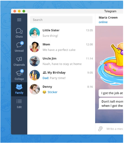 Come ogni altra cosa su Telegram, a eccezione delle chat segrete, le Cartelle chat si sincronizzeranno con tutte le altre app connesse, comprese quelle desktop. In queste ultime, grazie al maggiore spazio disponibile sullo schermo del computer, c’è una barra laterale per le cartelle, con alcune icone per rendere le cartelle più riconoscibili.