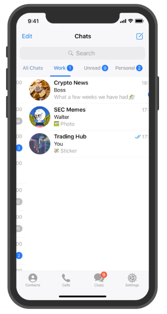 Per chi ha molte chat attive, le Cartelle chat, e i relativi tab, offrono la possibilità di tenere più organizzata la lista delle conversazioni. È ora possibile, ad esempio, tenere separate le conversazioni di lavoro da quelle familiari o personali, e scorrere tra le cartelle per accedere velocemente alle une o alle altre.