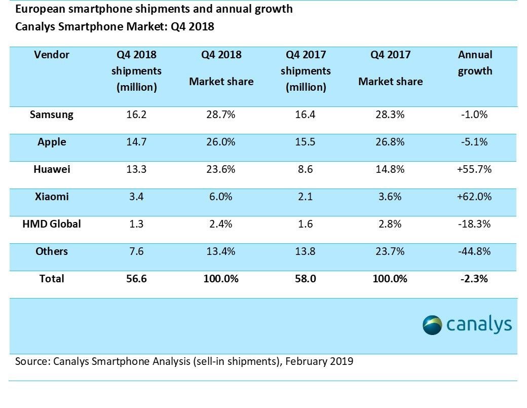Le stime di Canalys mostrano che le spedizioni europee di smartphone sono diminuite del 4% nel 2018, a 197 milioni di unità. Nel quarto trimestre del 2018 le spedizioni sono diminuite del 2% a 57 milioni.