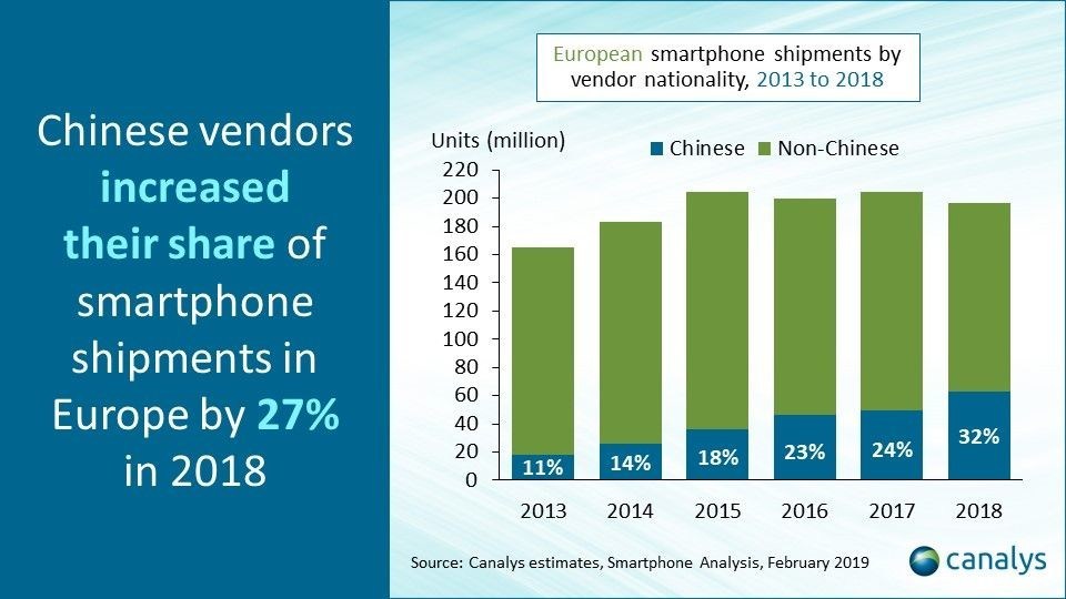 Le stime di Canalys mostrano che le spedizioni europee di smartphone sono diminuite del 4% nel 2018, a 197 milioni di unità. Nel quarto trimestre del 2018 le spedizioni sono diminuite del 2% a 57 milioni.