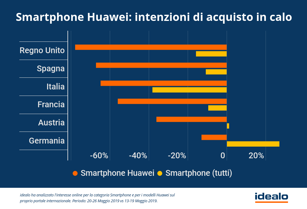 Ma, si è chiesta idealo, come si stanno comportando gli e-consumer nei confronti di Huawei? In questi giorni le ricerche sono calate in tutta Europa: Regno Unito (-77,8%), Spagna (-67,1%), Italia (-64,8%), Francia (-55,9%), Austria (-36,1%) ed infine Germania (-13,0%).