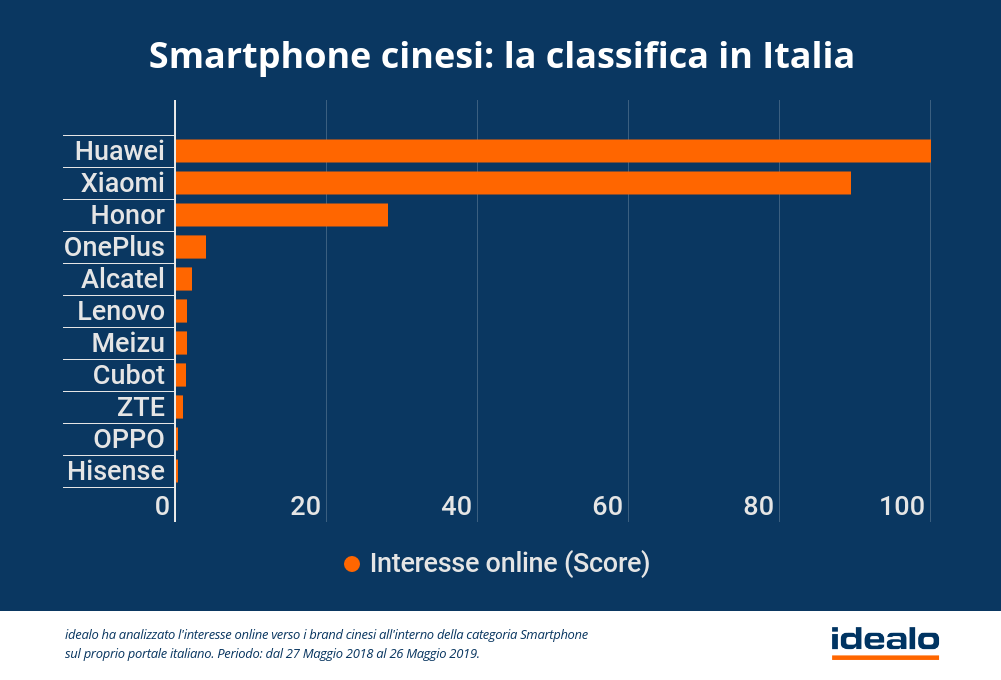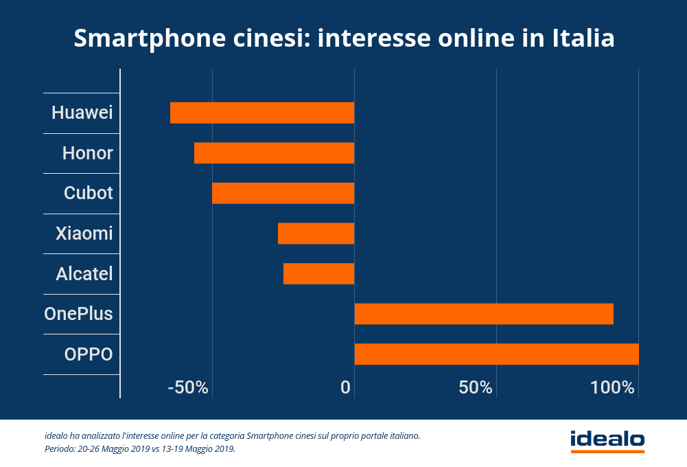 In Italia, in particolare, a crollare in questi giorni però non sono stati solo i device Huawei, ma anche prodotti di brand cinesi come Honor (-56,3%), Cubot (-50,0%), Xiaomi (-26,9%) e Alcatel (-25,0%). Viceversa, i brand cinesi in spinta positiva sono OnePlus (+91,0%) e Oppo (addirittura il +100,0% di ricerche).