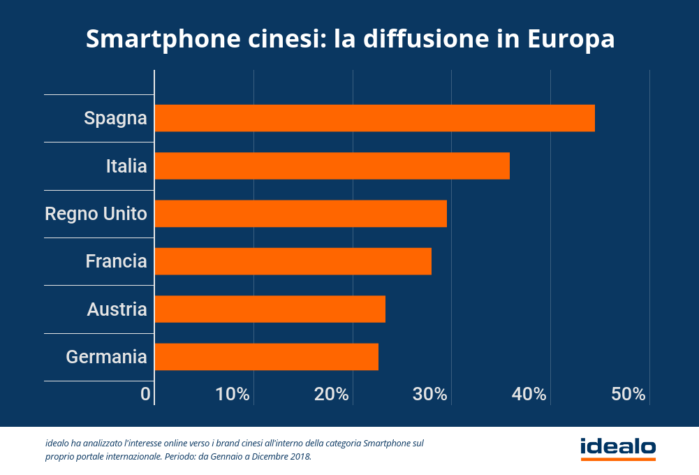 In Italia, prosegue la ricerca di idealo, la percentuale di diffusione degli smartphone cinesi è pari al 35,8% ed è tra le percentuali più alte di tutt’Europa (seconda solo alla Spagna, 44,4%). Segue poi il Regno Unito (29,5%), la Francia (27,9%), l’Austria (23,3%) e la Germania (22,6%).