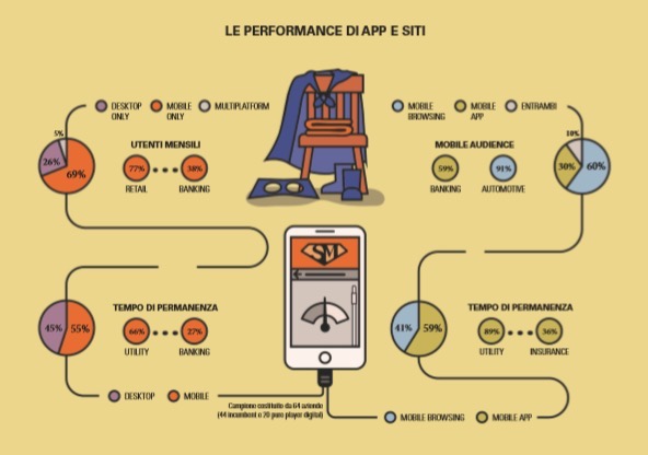 Relativamente alle attività svolte da mobile, è in aumento la percentuale di utenti che usa lo smartphone in tutte le categorie analizzate, come leggere e scrivere email, andare sui social, fruire contenuti video e così via. Degno di nota è l’incremento di 10 punti percentuali dell’uso di applicazioni di aziende di cui si è cliente (dichiarato dal 58% dei mobile surfer contro il 48% di un anno fa).