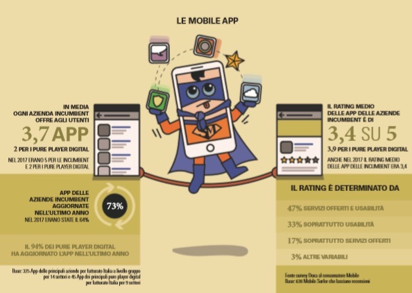 Nel corso della ricerca l’Osservatorio ha realizzato una mappatura e un’analisi delle mobile app offerte ai consumatori da parte delle principali aziende italiane per fatturato in 14 differenti settori (o “incumbent”). Nonché dei pure player digitali più rilevanti nelle medesime industry (o “digital”).