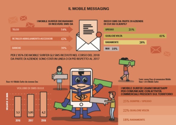 Il 90% dei mobile surfer afferma di ricevere almeno sporadicamente Sms di marketing e di servizio da parte delle aziende di cui è cliente (mobile messaging). E considera tali comunicazioni un’opportunità nel 44% dei casi. Gli Sms ricevuti provengono principalmente da Telco (secondo il 54% degli utenti), da retailer di abbigliamento e accessori (42%) e da banche (39%). Tra le imprese italiane continua a crescere l’utilizzo di Sms per l’invio di comunicazioni e messaggi di servizio (sia promozionali sia transazionali). Nel 2018 sono stati inviati 4,2 miliardi di messaggi, con un incremento del 6% rispetto al 2017.