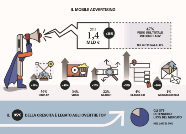Oltre 32 milioni di italiani utilizzano ogni mese dispositivi mobili (smartphone e tablet) per collegarsi a Internet, pari all’82% della popolazione online. Inoltre, ben il 41% di questi naviga solo da mobile. L’advertising via mobile riflette questi dati e supera 1,4 miliardi di euro. Esso arriva a pesare quasi la metà (47%) degli investimenti pubblicitari online e il 17% del totale mezzi (tv, stampa, radio, Internet).