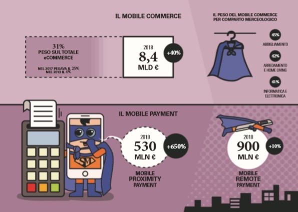 Invece, per quanto riguarda gli acquisti il Pc rimane dominante: solo il 17% dei mobile surfer afferma infatti di fare acquisti online prevalentemente da smartphone. I numeri del mobile commerce (ossia l’ecommerce B2c da smartphone) crescono comunque in maniera significativa. Nel 2018 in Italia sono stati superati gli 8,4 miliardi di euro, con un incremento del 40% rispetto al 2017. Gli acquisti online generati attraverso questo dispositivo costituiscono così il 31% dell’ecommerce totale (era il 25% nel 2017 e il 4% nel 2013).