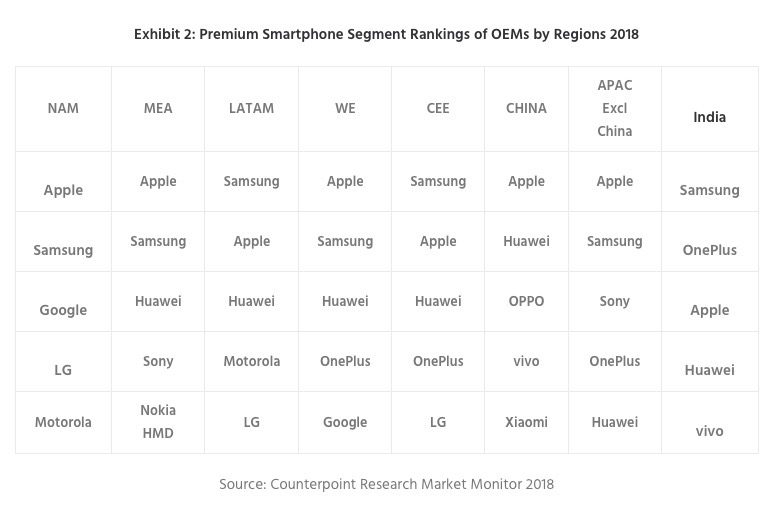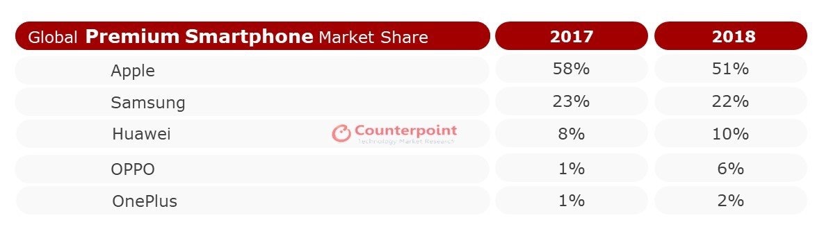Apple ha continuato a guidare il segmento degli smartphone premium a livello mondiale, conquistando oltre la metà del mercato, nel 2018. Mentre OnePlus è entrata per la prima volta, sempre nel 2018, tra i cinque migliori marchi del segmento premium.
