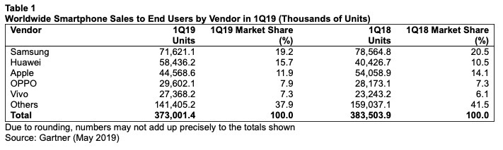 Nel primo trimestre del 2019, Samsung ha mantenuto il primo posto nelle vendite mondiali di smartphone, raggiungendo una quota di mercato del 19,2%. Huawei ha ottenuto la crescita più alta anno su anno, tra i primi cinque marchi al mondo, con un incremento del 44,5% e con vendite di smartphone che hanno raggiunto un totale di 58,4 milioni di unità.