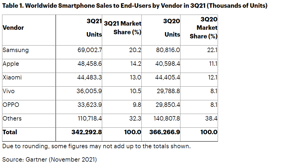 Apple ha recuperato la seconda posizione nelle vendite agli utenti finali e Xiaomi è tornata al terzo posto nel terzo trimestre del 2021.