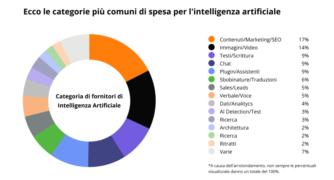 I servizi di trascrizione di Otter.ai assorbono il 5% degli investimenti, seguiti a ruota da Fireflies.ai (3%) che aiuta a trascrivere, prendere appunti e completare azioni durante le riunioni. Il restante 17% comprende circa 80 ulteriori servizi di intelligenza artificiale.