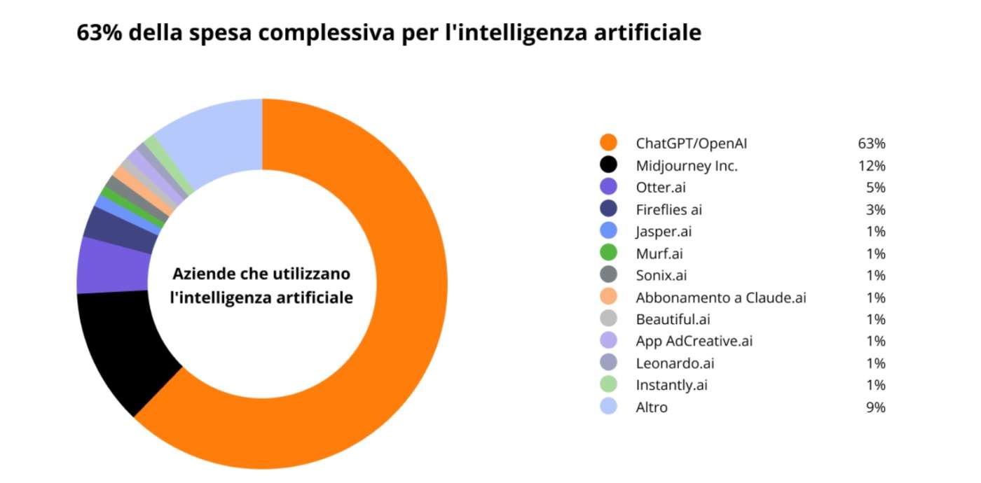 Secondo i dati di Soldo, che ha coinvolto più di 18.000 aziende clienti, ChatGPT di OpenAI domina il mercato, rappresentando il 63% della spesa complessiva delle aziende in intelligenza artificiale, mentre Midjourney è leader nella generazione di immagini, rappresentando il 12% della spesa.
