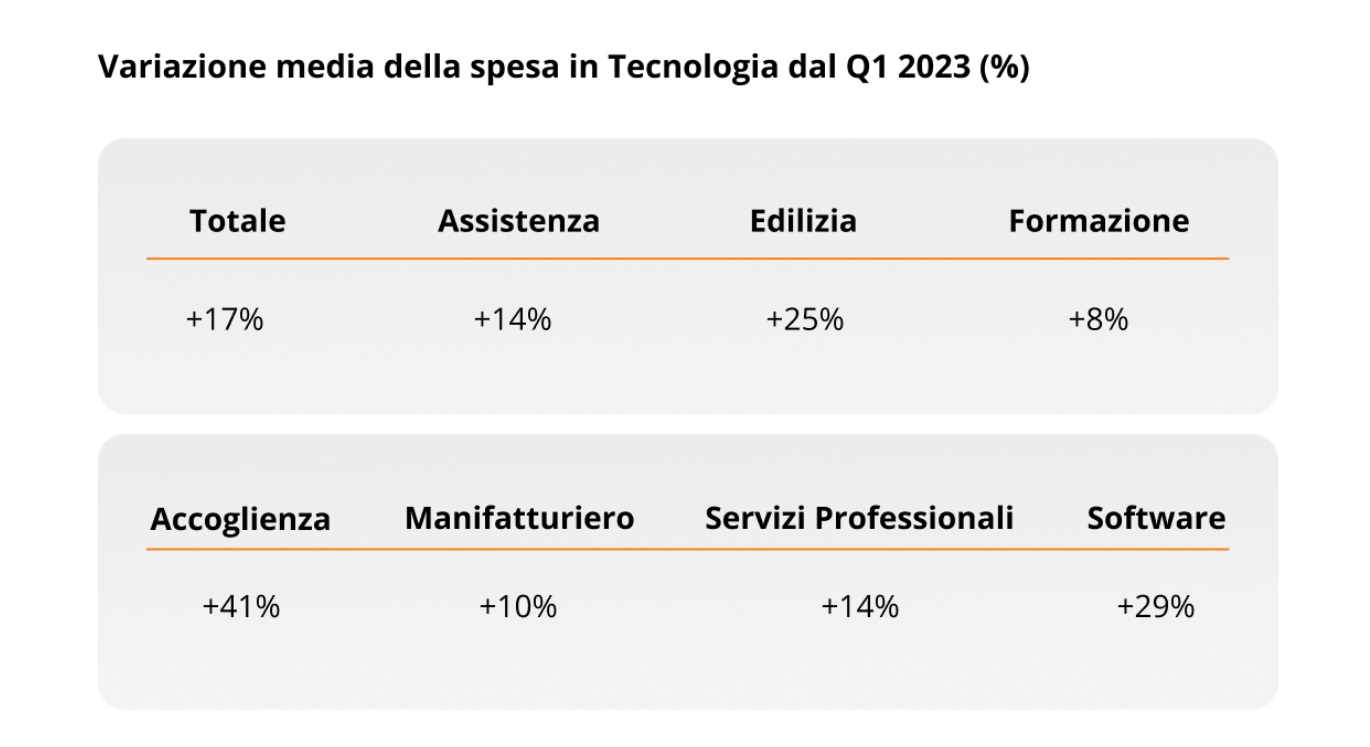 Osservando le tendenze in corso, la spesa media in tecnologia è stata notevolmente più elevata nel settore alberghiero, che ha registrato un aumento significativo della spesa IT del 41%, in quello del software (+29%) e nell’edilizia (+25%).