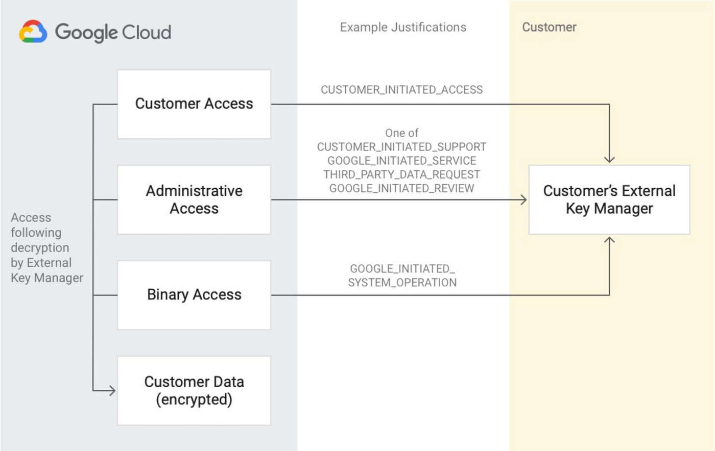 Il controllo crittografico sull’accesso ai dati si ottiene attraverso l’uso di Key Access Justifications (KAJ) insieme a Cloud External Key Manager (EKM).
