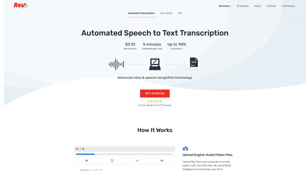 Rev è uno dei servizi di trascrizione umana più competitivi sul mercato, con costi che partono da 1 dollaro al minuto. Offre anche servizi di traduzione e sottotitoli. Le trascrizioni di solito vengono consegnate entro un minimo di 12 ore, ma il tempo può essere ridotto a 4 con un costo aggiuntivo. Per i clienti che desiderano sfruttare l’opzione digitale per risparmiare tempo, è disponibile anche una versione di Rev basata sull’intelligenza artificiale.