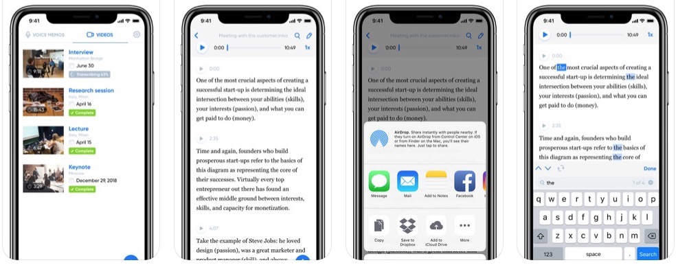 Transcribe – Speech to Text è un’app  iOS per la trascrizione, progettata esclusivamente per iPhone e iPad. L’app può essere utilizzata come registratore vocale gratuitamente, ma è necessario un pagamento per sbloccare le funzionalità di trascrizione audio e video. I file audio e video trascritti possono anche essere esportati e aperti su qualsiasi app compatibile all’interno dell’ecosistema iOS di Apple. Il costo è su base mensile, invece che al minuto o all’ora: 10 dollari al mese per tre ore di trascrizione oppure 29,99 al mese per 10 ore.
