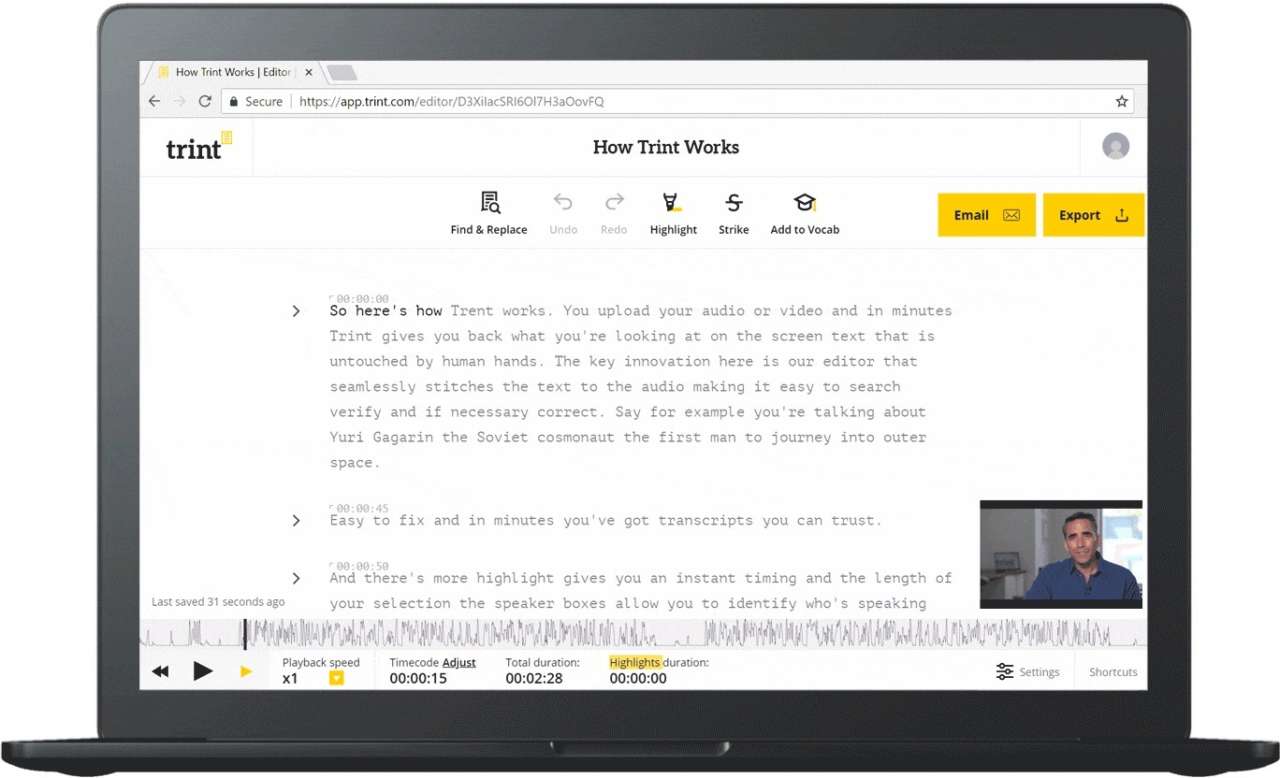 Trint offre un software voice-to-text che può comprendere e trascrivere un numero di accenti inglesi nonché 27 lingue a livello globale. Tuttavia, è meno preciso e più costoso di servizi come Temi, a causa del suo prezzo di 15 dollari all’ora. La sua versione desktop consente anche la modifica di utenti multipli.