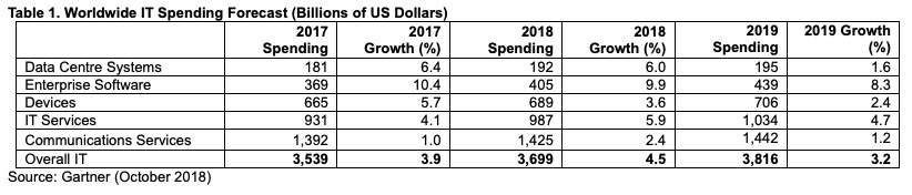 La spesa IT a livello mondiale potrebbe raggiungere un totale di 3800 miliardi di dollari nel 2019. Con un aumento del 3,2% dalla spesa IT prevista di 3,7 trilioni di dollari nel 2018. Tali dati sono tratti dalle ultime previsioni di Gartner.
