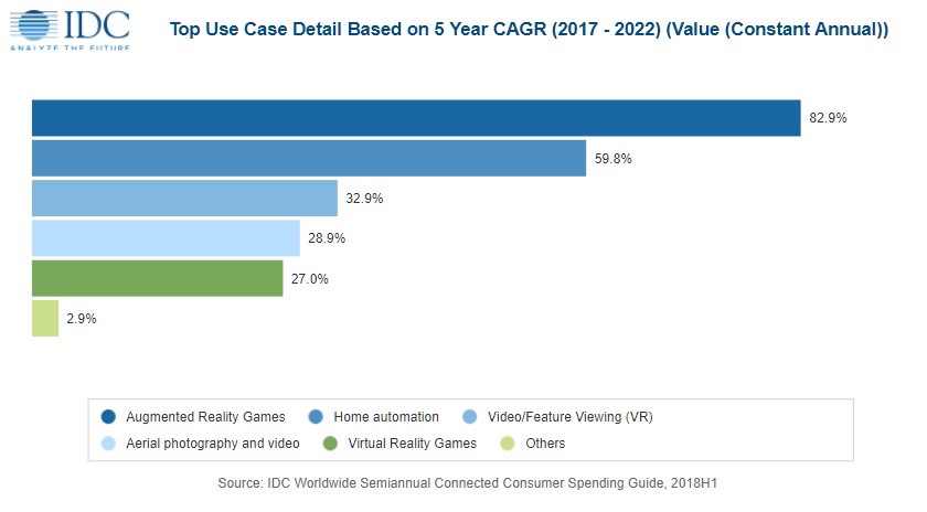 A conoscere la crescita della spesa più rapida nel periodo di previsione sono i giochi in realtà aumentata (CAGR 82,9%) e la domotica (CAGR 59,8%).