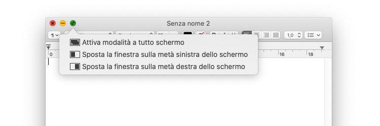 macOS Split View• macOS mostra un menu contestuale contenente tre opzioni. La prima, Attiva modalità a tutto schermo, ha lo stesso effetto di ingrandimento della finestra che avviene al clic diretto sul pulsante. Le altre due, Sposta la finestra sulla metà sinistra dello schermo e Sposta la finestra sulla metà destra dello schermo, ridimensionano e agganciano la finestra alla metà dello schermo selezionato.