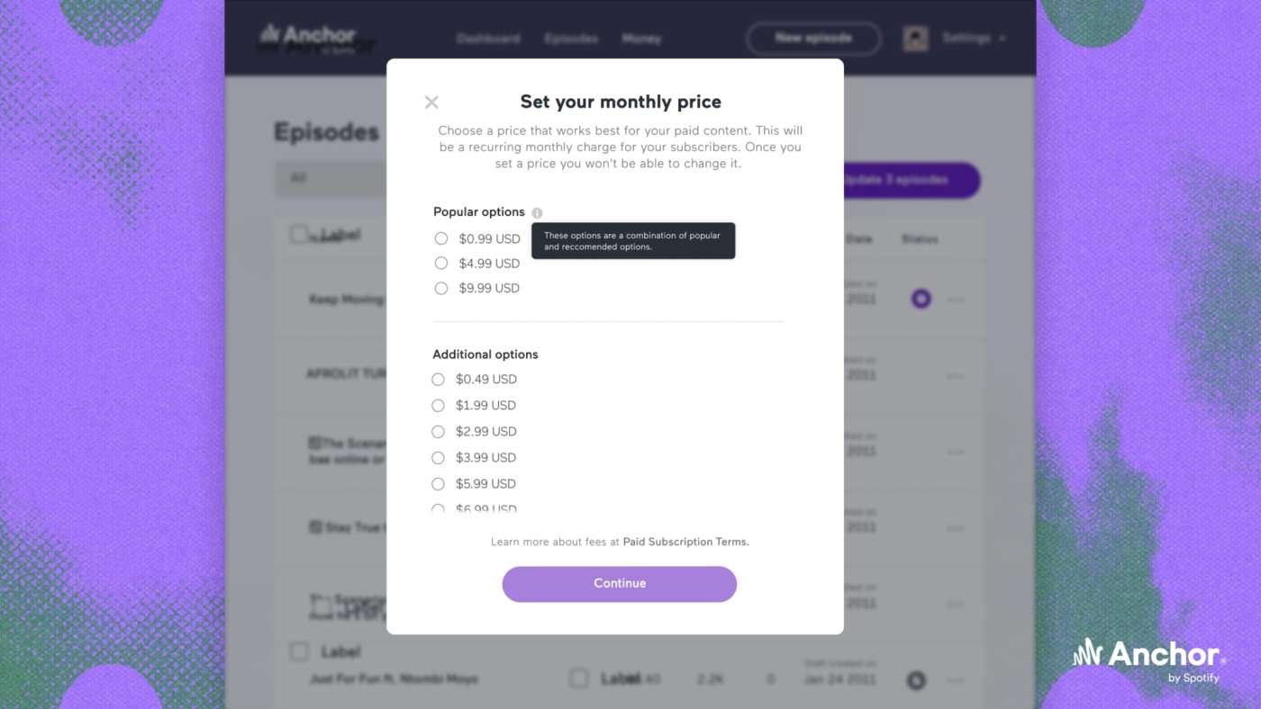 I creatori di contenuti possono scegliere tra 20 opzioni di prezzo così come inviare email agli abbonati (quelli che hanno fatto opt-in per le comunicazioni), al fine di coltivare ulteriormente la propria community di ascoltatori.