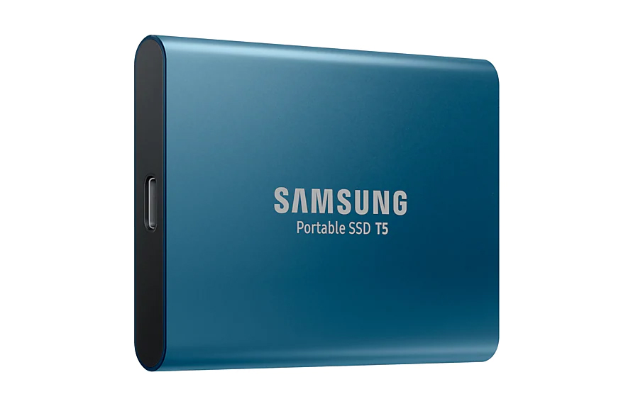 Il colosso sudcoreano, tra le aziende leader, tra le altre cose, anche nel settore dei semiconduttori, non poteva mancare nel panorama degli SSD portatili, dove è presente non solo con la propria memoria flash, ma anche con prodotti finiti per gli utenti finali. Ad esempio la famiglia Samsung Portable SSD T5 comprende diversi modelli con un ventaglio di opzioni per colore e capacità di archiviazione, il cui range va da 250 GB a 2 TB. Il Portable SSD T5 impiega la memoria flash V-NAND di Samsung e un’interfaccia USB 3.1 di seconda generazione: offre velocità di trasferimento fino a 540 MB/s, in un design tendente al minimalismo, con una struttura monoscocca realizzata interamente in metallo e dai bordi arrotondati. L’unità Portable SSD T5 di Samsung punta sulla leggerezza e sulla compattezza: solo 51 grammi di peso, uno spessore di appena 10,5 mm e dimensioni di 74 x 57,3.