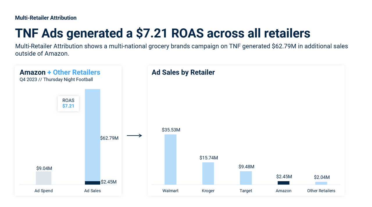 One case study involving a large multinational grocery company showed a $10 million Thursday Night Football campaign delivered $63 million in additional sales across non-Amazon retailers, such as Walmart, Target, Kroger, and other retailers.