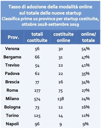 Secondo il rapporto del Ministero dello Sviluppo Economico, la modalità online è stata scelta da poco meno di 4 startup su 10 costituite in Italia nell’ultimo anno. Questo dato è in lieve ribasso, nel quarto trimestre 2019; tuttavia, evidenzia il Mise, la variabilità territoriale è molto elevata, con notevoli scostamenti rispetto al dato nazionale.