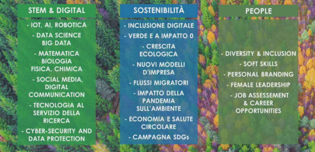 Saranno tre gli ambiti di formazione durante il mese: Stem & Digital, Sostenibilità, People, e le audience riguardano tutto il percorso scolastico, dalle scuole dell’obbligo alle università.