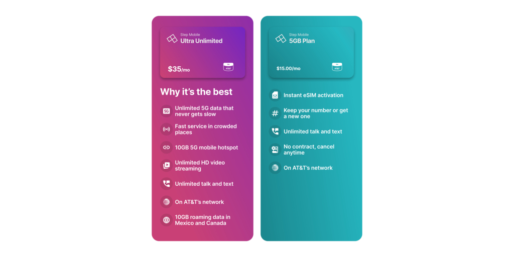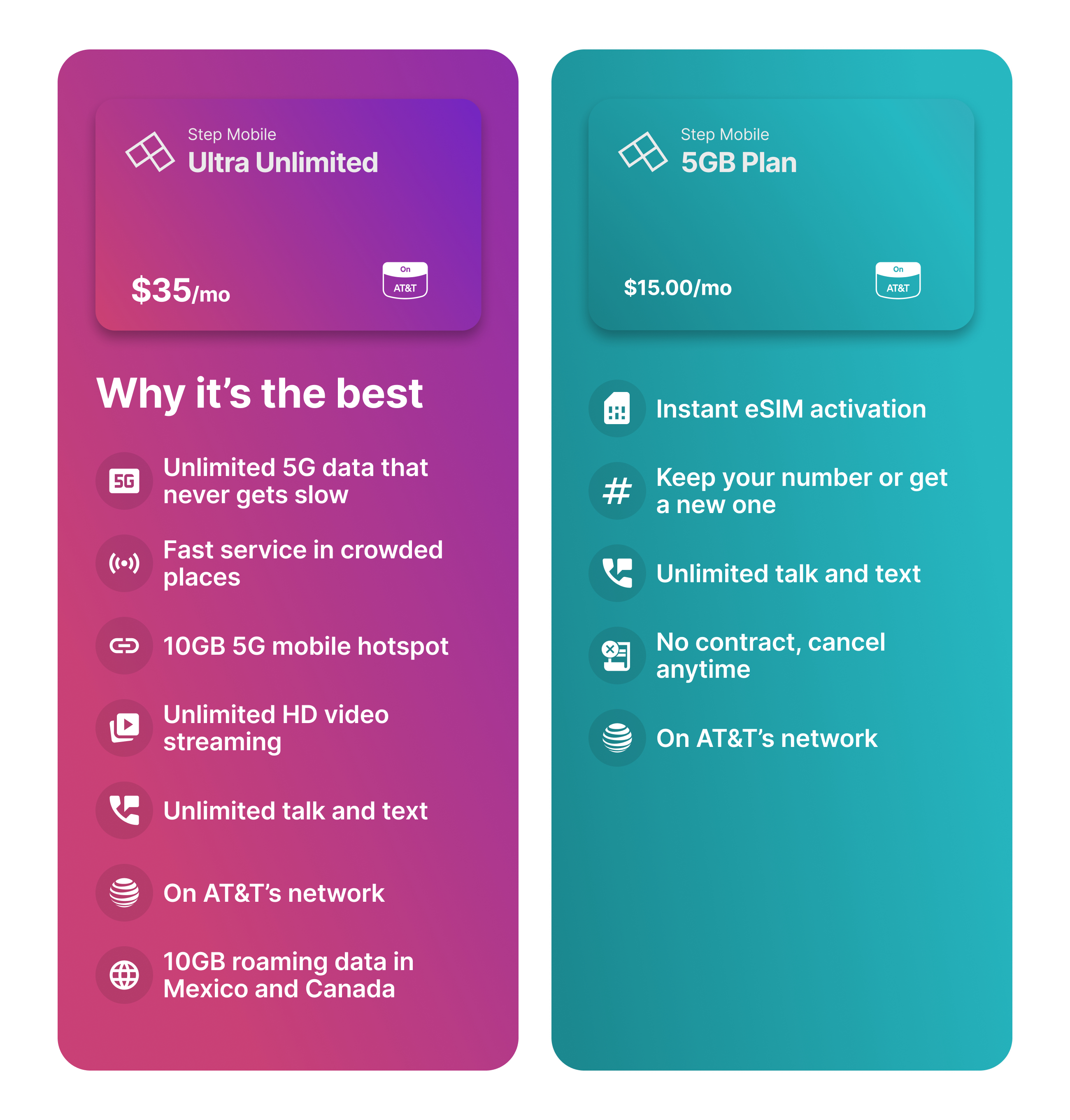 Exclusively available to Step customers, the new service, on AT&T’s network, features two mobile plans: a 5GB plan for only $15/month and an Ultra Unlimited plan offering unlimited 5G data for $35/month.