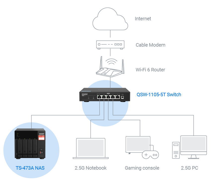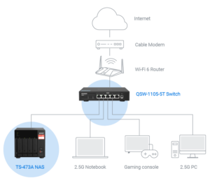 - TS-473A + QSW-1105-5T: Questo bundle è ideale per le PMI che cercano un’archiviazione robusta con elevate prestazioni di rete. Il TS-473A, con processore quad-core AMD Ryzen, offre una capacità di espansione flessibile e supporto per le applicazioni container e virtualizzazione.