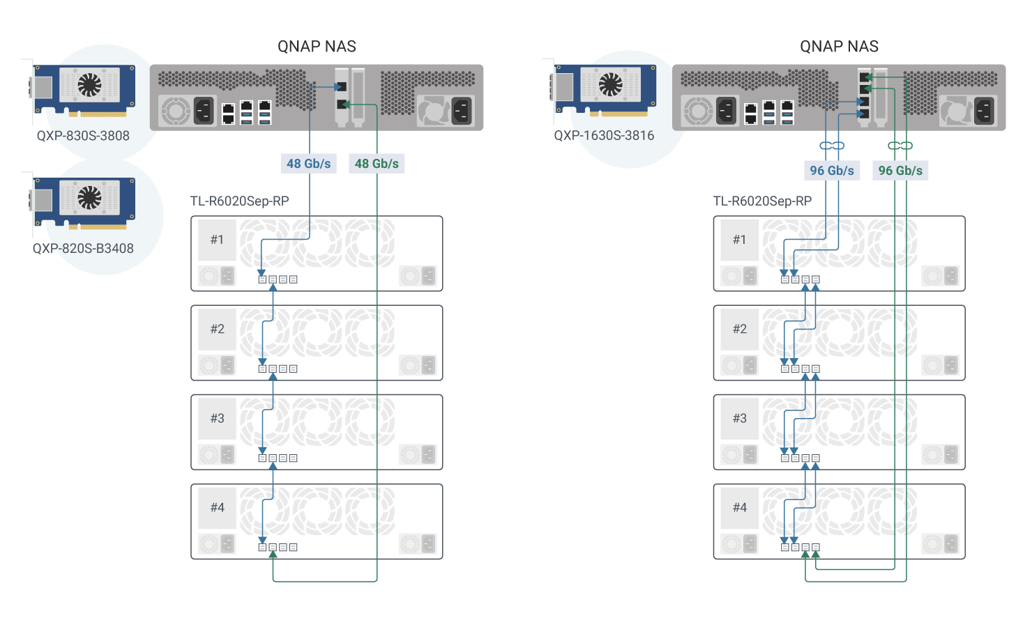 Come avviene anche in altri modelli QNAP, la flessibilità delle connessioni SAS consente di adottare configurazioni non solo in daisy chain, ma anche in cluster paralleli tramite più schede SAS. Ciò permette di ridurre la latenza e migliorare la banda complessiva, mantenendo allo stesso tempo un controllo centralizzato tramite Storage & Snapshot Manager.