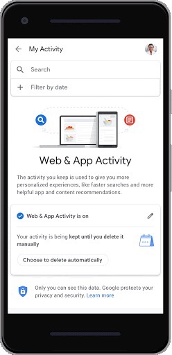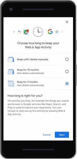 Le nuove opzioni di gestione di questi dati personali saranno più articolate e flessibili. L’utente avrà la facoltà di decidere di mantenere la cronologia delle posizioni e le attività web e app finché non cancellerà manualmente questi dati.