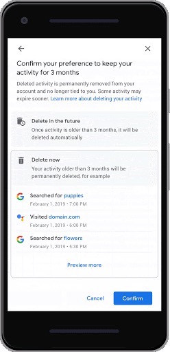 In più, saranno disponibili due opzioni di eliminazione automatica dei dati relativi alle proprie attività. Una mantiene i dati per tre mesi, dopodiché li elimina automaticamente. L’altra li conserva per 18 mesi prima che avvenga la cancellazione automatica. Tutti i dati più vecchi, spiega Google, “verranno automaticamente eliminati dal vostro account in modo continuativo”.