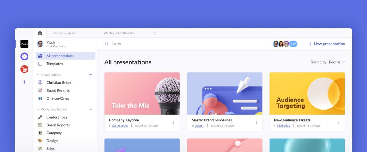 Pitch è uno strumento collaborativo per la creazione e la distribuzione di presentazioni in team: è attualmente in fase di early access e, anche se non è stata ancora definita una data di lancio ufficiale, i piani di roll-out erano per un rilascio definitivo entro il 2020.