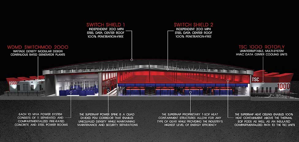 Per la temperatura non c’è problema visto che i data center di Switch, la casa madre, nascono nel deserto del Nevada. Il luogo ideale per costruire una struttura che ospita la mail di Libero.it e fra poco anche quella di Virgilio, otre a essere collegato con 11 telco carrier. Esteso su 42mila mq, a regime sarà organizzato in quattro settori, l’uno indipendente dall’altro con quattromila armadi con la possibilità di gestire oltre 40 megawatt di potenza.