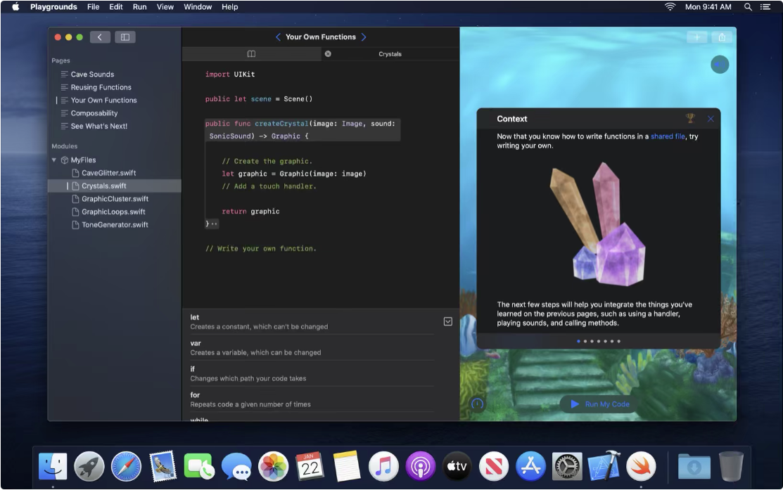 Swift Playgrounds presenta lezioni, sfide che stimolano la creatività e incentivano l’apprendimento, modelli per creare i nostri playground e suggerimenti per imparare a scrivere il codice nel modo giusto.