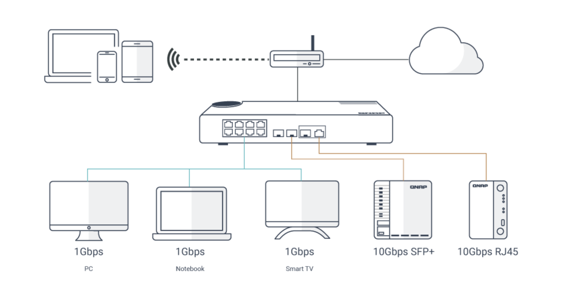QSW-308-1C è compatibile con le tecnologie 10GbE e NBASE-T per supportare fino a cinque velocità (10G / 5G / 2,5G / 1G / 100M). La porta combinata SFP+/RJ45 (rame) offre velocità di trasmissione più alte con i cavi esistenti. In base ai tipi di cavi e alla lunghezza, possono essere raggiunte diverse velocità per trasferimenti di dati più efficienti e rapidi.