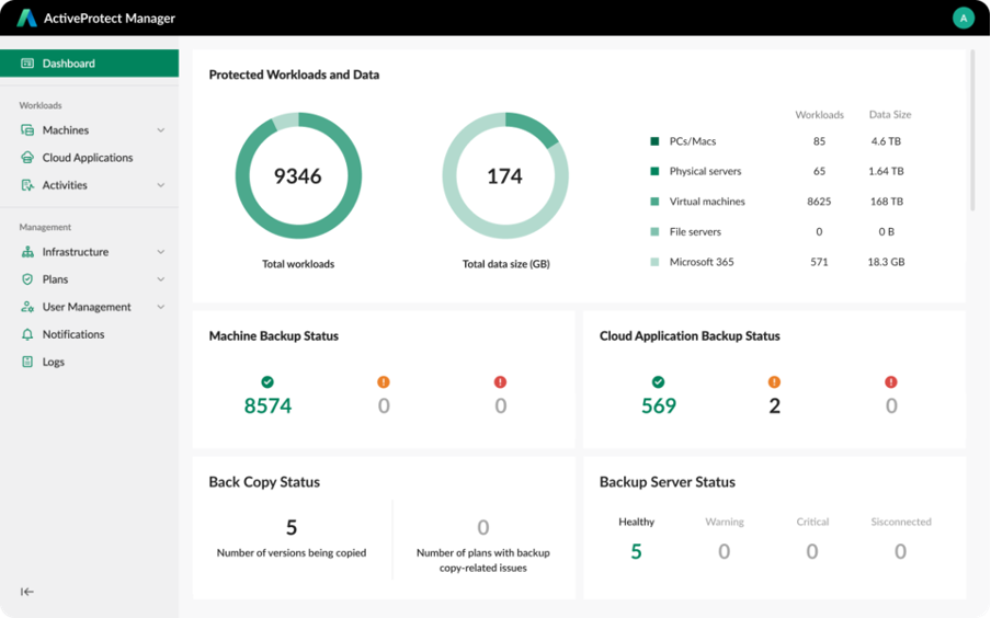 - Visibilità sui dati: Consolida e visualizza fino a 150.000 carichi di lavoro e monitora 2.500 siti tramite un’unica interfaccia, inclusi tutti i backup, le loro copie e i dati archiviati nell’ infrastruttura di backup.
