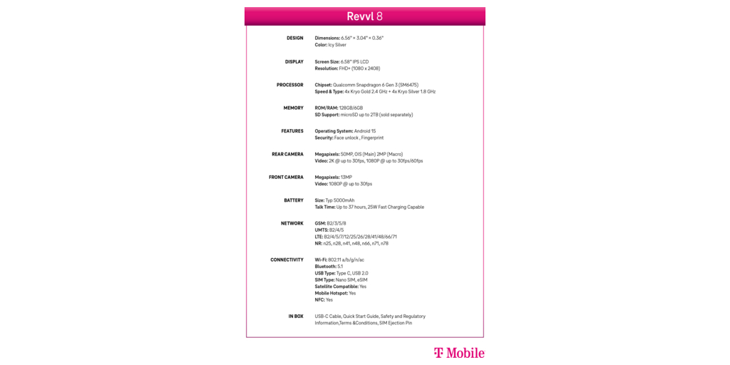 Learn more about the T-Mobile’s Revvl lineup at: www.t-mobile.com/offers/t-mobile-revvl-phone-deals. For more information on Revvl 8 at Metro, visit www.metrobyt-mobile.com/cell-phones/brand/t-mobile.