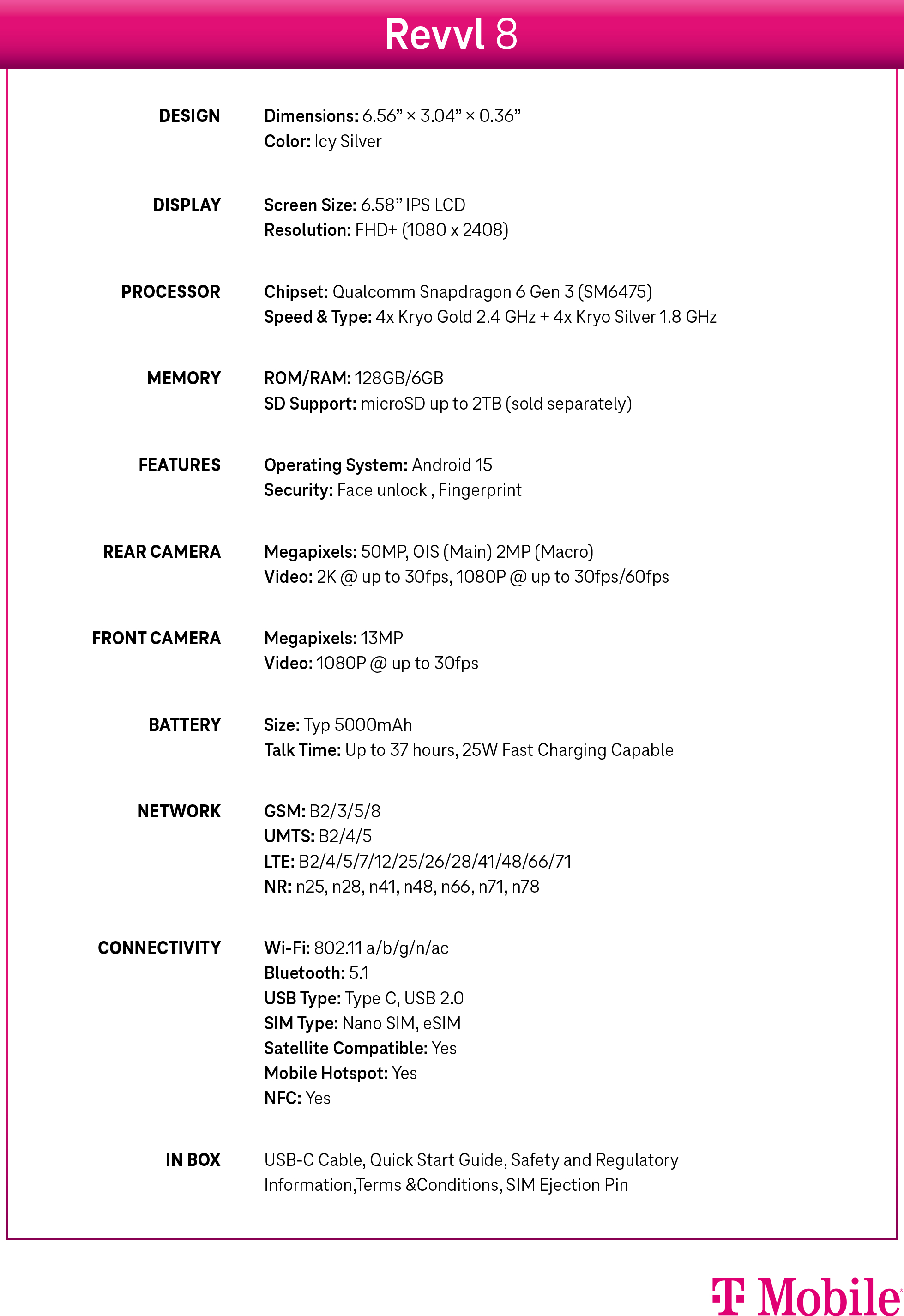 Learn more about the T-Mobile’s Revvl lineup at: www.t-mobile.com/offers/t-mobile-revvl-phone-deals. For more information on Revvl 8 at Metro, visit www.metrobyt-mobile.com/cell-phones/brand/t-mobile.