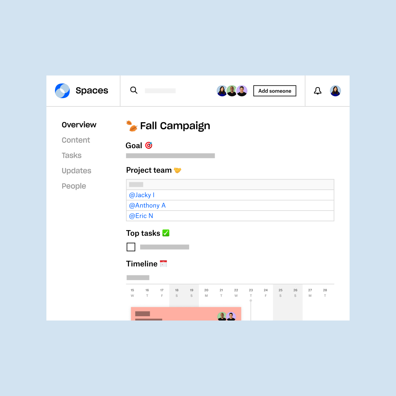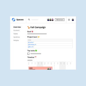 Spazio di lavoro virtuale che unisce progetti e team. Con Spaces i gruppi di lavoro possono accedere a tutto quello che serve per un progetto, come file, attività, riunioni e date.