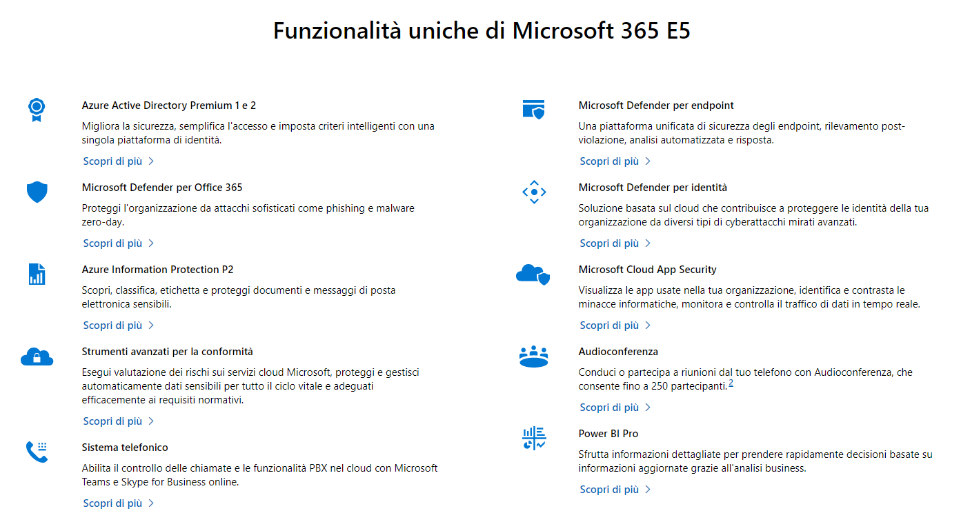 Microsoft 365 E5 combina le migliori app di produttività e collaborazione con funzionalità avanzate di comunicazione, sicurezza, conformità e analisi dei dati. La soluzione abilita, infatti, la protezione contro il furto dell’identità e di informazioni, integra strumenti avanzati di conformità per proteggere e gestire i dati riducendo al contempo i rischi, insieme a funzionalità di sicurezza automatizzate in grado di bloccare anche le minacce più avanzate. Inoltre, Microsoft 365 E5 supporta i team sempre più estesi e distribuiti grazie a funzionalità come l’audioconferenza e le chiamate in cloud e offre l’accesso, tramite Power BI, ad analisi e insight utili per ottenere il massimo valore di business dai dati.